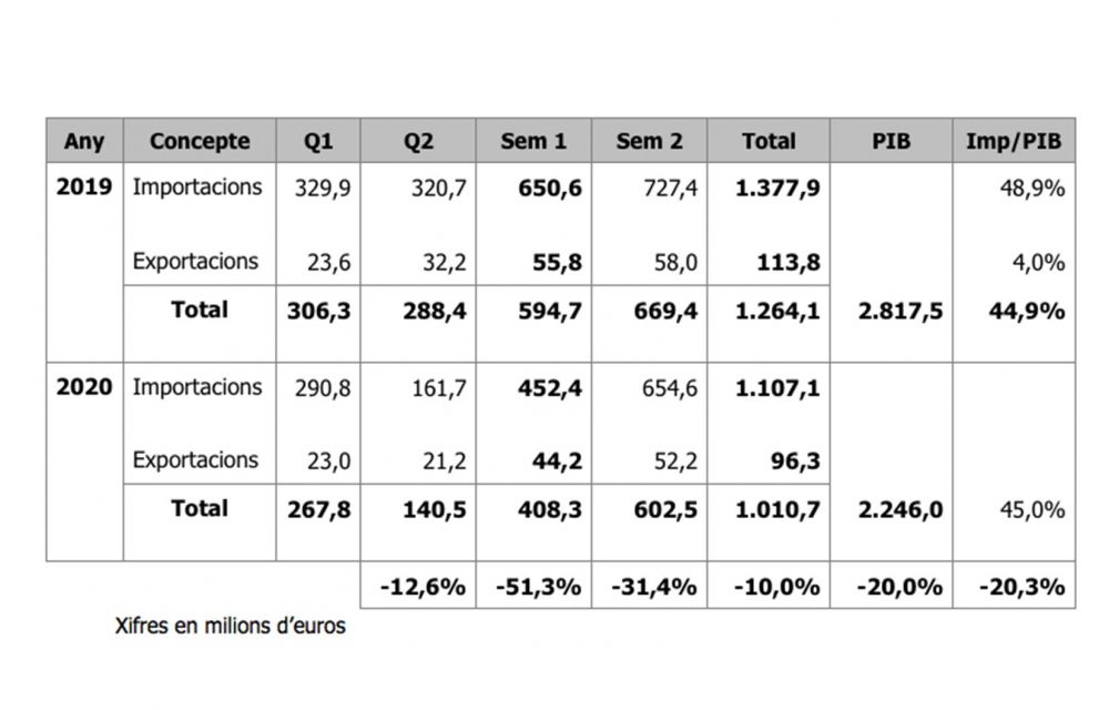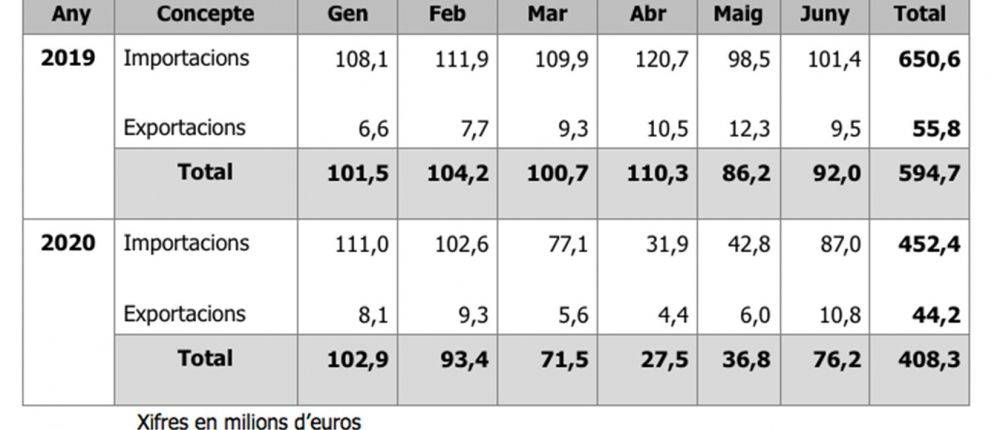 Si a les importacions li restem les exportacions, s’obté l’anomenada ‘absorció interna’ o demanda interna. És a dir, entre el que s’adquireix fora i el que el país ven a l’exterior en surt allò que es consumeix internament. Així les coses, i vistes les dades oficials que consten en bases de dades públiques accessibles a través de canals telemàtics (webs), durant el primer trimestre la caiguda de la demanda interna va ser del 12,6%. Al segon trimestre la davallada de la demanda interna, en plena crisi sanitària i amb dos mesos pràcticament de confinament, va arribar al 51,3%. En la primera meitat de l’any, per tant, la demanda va caure un 31,4%.