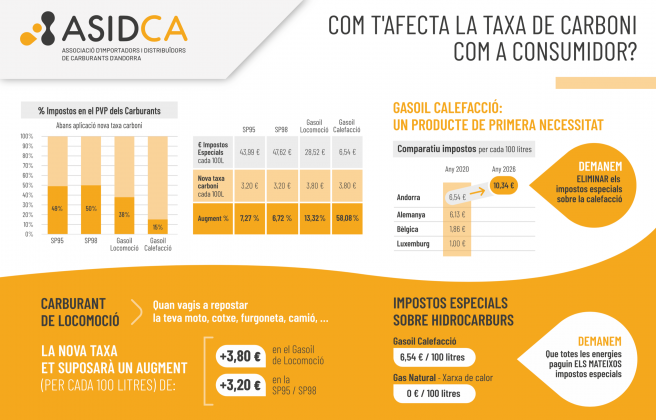Els importadors de carburant han tornat a insistir aquest dimecres en com de negativa serà la taxa sobre el carboni i han posat damunt la taula un comparatiu de l’impacte que tindrà. L’ASIDCA adverteix que amb la nova taxa de carboni prevista per l’executiu els consumidors destinaran a impostos especials més de la meitat del que paguen pel litre de gasolina. Es demana aplicar polítiques que en aquest àmbit han posat en marxa països veïns com França i Espanya, que han desistit d’apujar les taxes dels carburants. “A qui es castiga és al ciutadà, que veurà incrementats els preus finals que haurà de pagar per gasolina i gasoil”, han remarcat des del col·lectiu empresarial.