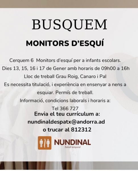 En l’anunci s’explicava que es buscaven sis monitors d’esquí per a infants, tot just per a uns dies. De fet, l’empresa, justament, està especialitzada en llocs de treball temporal. Més concretament, la feina s’havia de prestar els dies 13, 15, 16 i 17 de gener de nou del matí a quatre de la tarda a tres ubicacions: Grau Roig, Canaro o Pal.