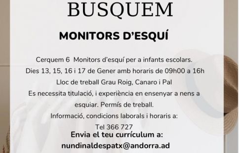 En l’anunci s’explicava que es buscaven sis monitors d’esquí per a infants, tot just per a uns dies. De fet, l’empresa, justament, està especialitzada en llocs de treball temporal. Més concretament, la feina s’havia de prestar els dies 13, 15, 16 i 17 de gener de nou del matí a quatre de la tarda a tres ubicacions: Grau Roig, Canaro o Pal.