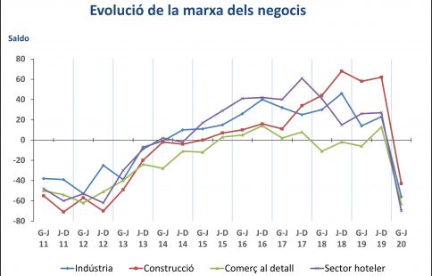 Des d’una òptica sectorial l’afectació ha estat general, però hi ha hagut diferències notables entre sectors. Durant el primer semestre de l’any 2020, la indústria i la construcció han registrat una caiguda relativament més moderada, ja que a mesura que s’han anat aixecant les restriccions, la recuperació també està sent més ràpida i constant. En canvi, les activitats més directament vinculades al turisme (el comerç, l’hoteleria, la restauració, les agències de viatges, el transport de viatgers, les activitats culturals i d’oci...) presenten un panorama més fosc.