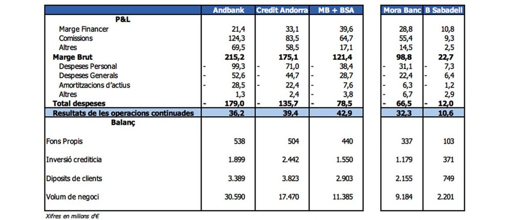 L’entitat resultant de la suma de MoraBanc i BancSabadell d’Andorra, si s’acaba tancant la negociació de compra-venda, no seria la primera del país quant a volums. Si s’agafen les dades referents al tancament del 2020, Andbank i Crèdit Andorrà continuarien al davant en moltes facetes del negoci. Ara bé, és clar, però, que aquestes dues entitats tenen molt més negoci a l’estranger que no pas MoraBanc. I el Sabadell andorrà, òbviament, està focalitzat únicament al Principat.