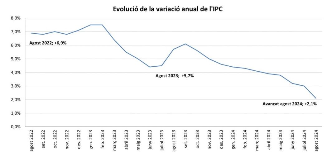 Així, l’IPC a 31 d’agost tanca en un 2,1%. Això, en cas de confirmar-se, suposaria una davallada considerable, de gairebé un punt, en comparació a la xifra amb què va finalitzar juliol, que era del 3%. També és la dada més baixa en tres anys. Caldria remuntar-se tres anys enrere, a agost del 2020, per trobar una xifra més moderada, del 2%.