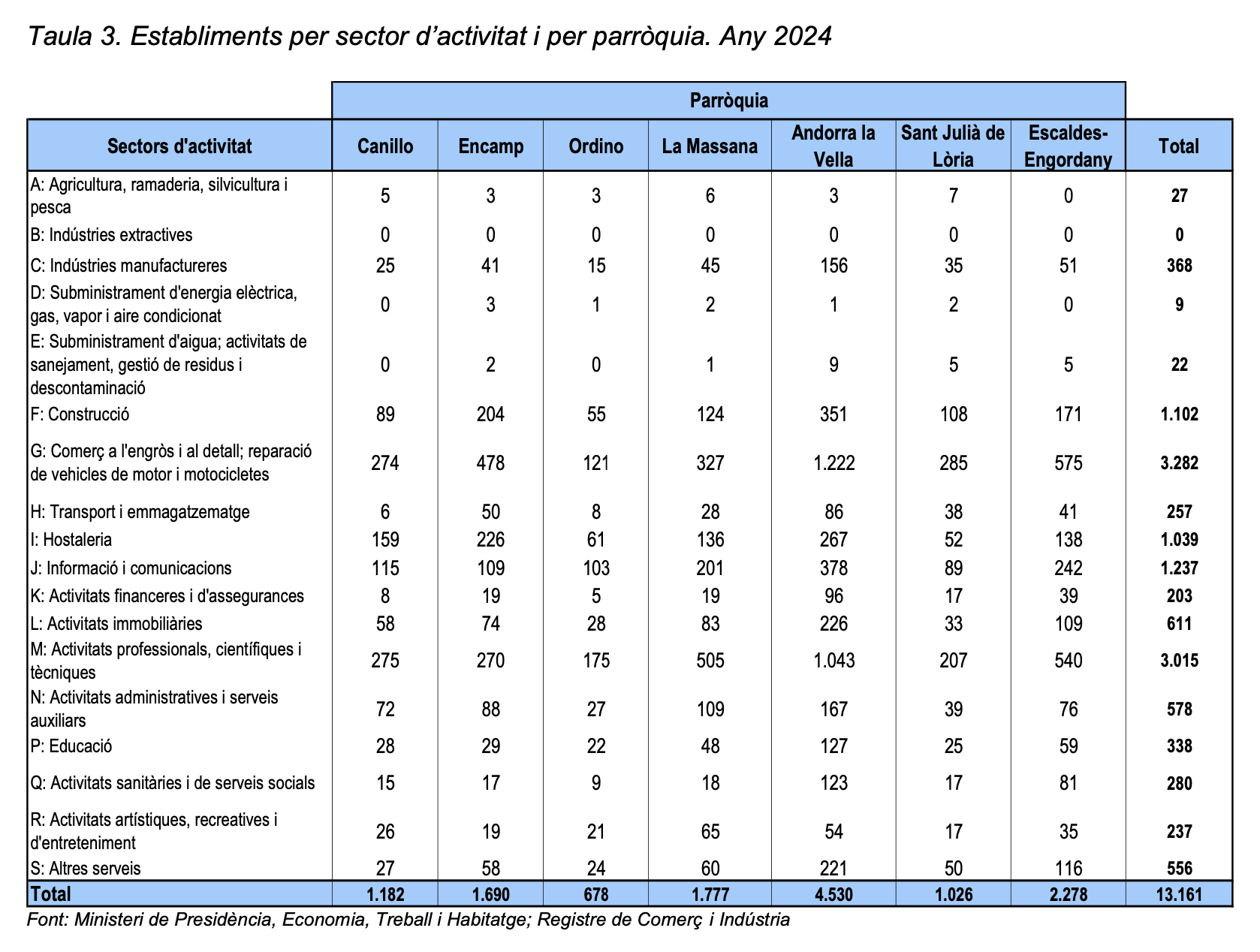 El nombre d’establiments inscrits al Registre de Comerç i Indústria a finals del 2024 s’ha situat en 13.161, la qual cosa representa un augment anual del +5,8% (+726 establiments) respecte l’any anterior. En l’àmbit sectorial es detecta que, segons l’activitat econòmica de la CAEA-2019 (classificació d’activitats econòmiques d’Andorra de l’any 2019) declarada com activitat principal, el 57,2% dels establiments es centralitzen en tres sectors d’activitat.