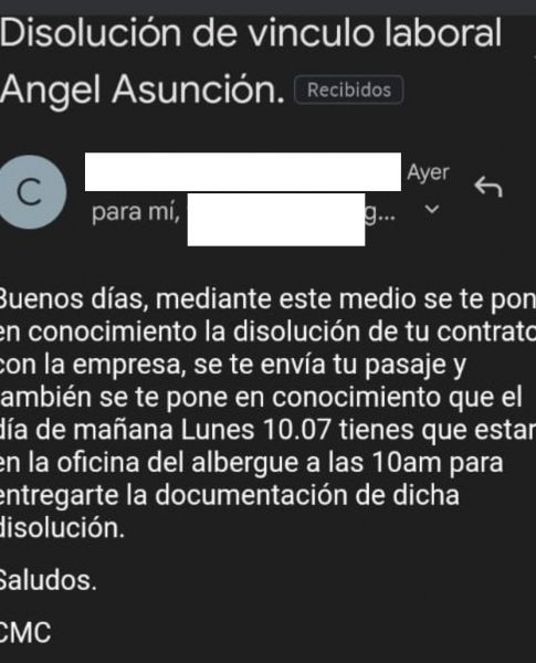 L’Ángel admet que durant el diumenge no va mirar el correu i relata que dilluns, quan anava a agafar el vehicle amb què se’ls transporta a les diferents obres, va ser quan es va assabentar de l’acomiadament. I, també, de la intenció de Casyre d’enviar-lo ràpidament cap al seu país d’origen. De fet, ja se’l va fer fora també directament de l’hotel. “No vaig voler signar res”, ha comentat. El que sí que va fer va ser anar a Inspecció de Treball. Volia presentar una denúncia pel que considera que són abusos laborals.