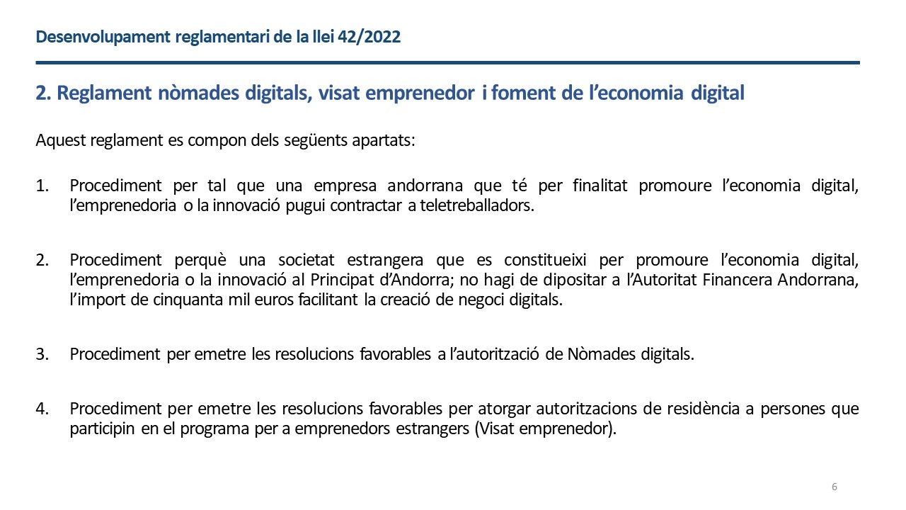 Entre els tres, possiblement, destaca especialment el que se centra en els nòmades digitals, visat emprenedor i foment de l’economia digital. Sobretot, per la curiositat i, segons el ministre d’Economia en funcions, Jordi Gallardo, interès que genera l’aterratge d’aquesta figura de treballador digital. Per definició es tracta d’un empleat d’una empresa, generalment multinacional o amb una grandària important, que treballa a distància, desenvolupant la seva tasca no necessàriament a prop del seu centre d’interès. Amb aquest reglament, Gallardo ha apuntat que es pot donar resposta a les sol·licituds que s’han fet d’informació en aquest sentit constantment i, a més, “permet que persones que treballen en empreses de fora d’Andorra puguin venir a exercir al país sota un permís especial la seva tasca telemàtica”.
