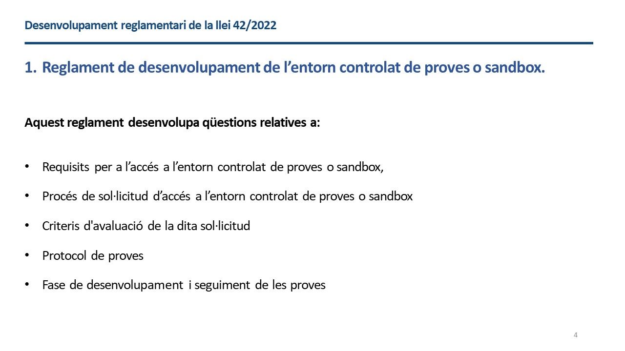 Amb aquest segon reglament es busca crear un entorn de proves concret i fixat per dur a terme un producte que s’estigui impulsant i poder testejar-lo. Gallardo ha remarcat que “és una zona controlada on els emprenedors poden posar a prova els productes o serveis abans de llençar-los a mercats més grans”. Es tracta d’un concepte que es fa servir en sectors que tenen, segons Galabert, “legislacions més complicades”, com pugui ser el financer. D’aquesta manera, es permet a l’administració “poder veure quin és el funcionament d’aquella innovació i com cal regular-ho, perquè ens trobem que la innovació camina molt més ràpid, i tenir aquests espais de proves permet analitzar els efectes jurídics per no cometre errors”.