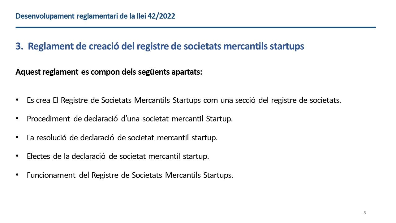 Gallardo ha assegurat que “s’ha detectat que l’ecosistema d’startups és molt gran i no està tan interconnectat com hauria d’estar”. Per tant, la creació d’aquest registre haurà de permetre tenir un seguiment més acurat de com evoluciona aquest ecosistema i “poder acompanyar amb iniciatives”, ha remarcat Gallardo. Així mateix, Galabert ha assenyalat que la condició d’startup no és indefinida i que, per tant, es poden establir els límits i es poden controlar. Com a exemple, “quan la societat no reparteixi dividends no acaba de començar, té un grau de maduresa que no implica que hagi de tenir certes facilitats”.