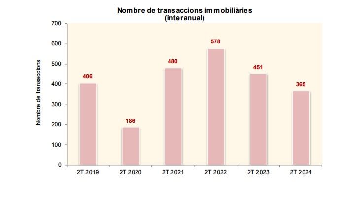 Durant el segon trimestre de l’any s’han realitzat 365 transaccions immobiliàries, un 19% menys que fa un any, el que representa una caiguda de 86 operacions. Cal tenir en compte que a mitjan febrer es va aixecar la moratòria per als inversos estrangers i caldrà veure si la caiguda és fruit del nou impost que grava les operacions immobiliàries per part de forans o el termini que es triguen a autoritzar-les.