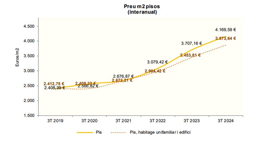 Així ho posen de manifest les dades fetes públiques aquest dijous pel departament d’Estadística. Si ens fixem en les dades dels darrers tres mesos, el preu per metre quadrat s’ha tornat a encarir, en aquest cas un 12,5%. D’aquesta manera, se situa en els 4.169,59 euros, superant la del primer trimestre de l’ant, que també havia superat els 4.000 euros. Així mateix, el valor dels béns immobles tramesos ha estat de 266,6 milions d’euros, un 12,4% més que de juliol a setembre del 2023.