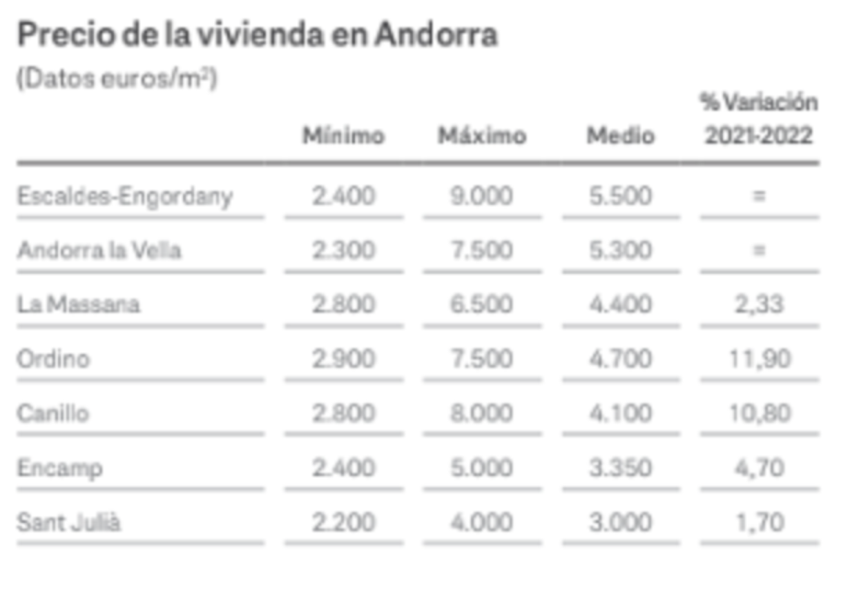 El preu de les propietats puja a tot Andorra, però el major increment es va produir a Ordino amb un 11,90% i a Canillo amb un 10,80%. En aquestes dues parròquies, el preu mínim es va situar entre 2.800 i 2.900 euros el metre quadrat i el màxim entre 7.500 i 8.000. En el cas d’Andorra la Vella i Escaldes no hi ha variacions, però sí que s’ha de destacar que és a Escaldes-Engordany on s’han pagat 9.000 euros per metre quadrat. L’informe exposa que les zones residencials de Can Diumenge i Sa Calma són les que concentren la demanda de cases més grans de més de 500 metres quadrats. A la Massana també s’observa un interès per les cases grans amb jardí, que s’uneix a la cerca d’apartaments de tres dormitoris de fins a 1509 metres quadrats similars als que es busquen a Ordino i Andorra la Vella.
