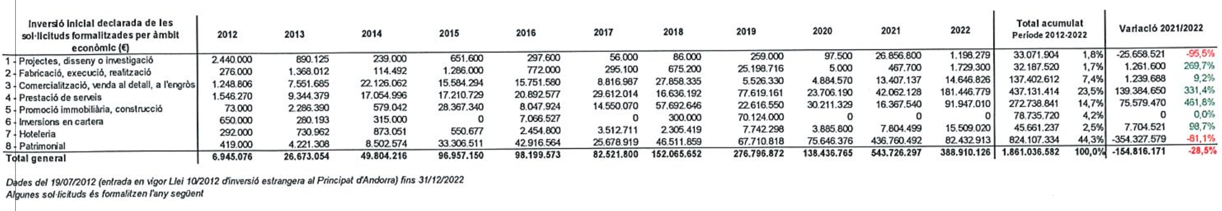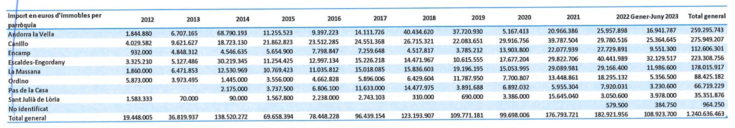 Aquesta inversió es desemborsa en societats que tenen com a objecte la promoció immobiliària. I és evident que tenen un interès molt concret. Però jurídicament es diferencia de la inversió estrangera en immobles, que va directament a compra d’immobles sense injectar en participacions societàries. Justament, quant a la inversió estrangera immobiliària, la declarada “és també molt rellevant”. En els darrers deu anys, des del 2012, s’han declarat 4.718 transaccions en immobles derivats d’aquest desemborsament dinerari forani. Tot plegat suposa un import declarat de 1.240.636.463 euros.