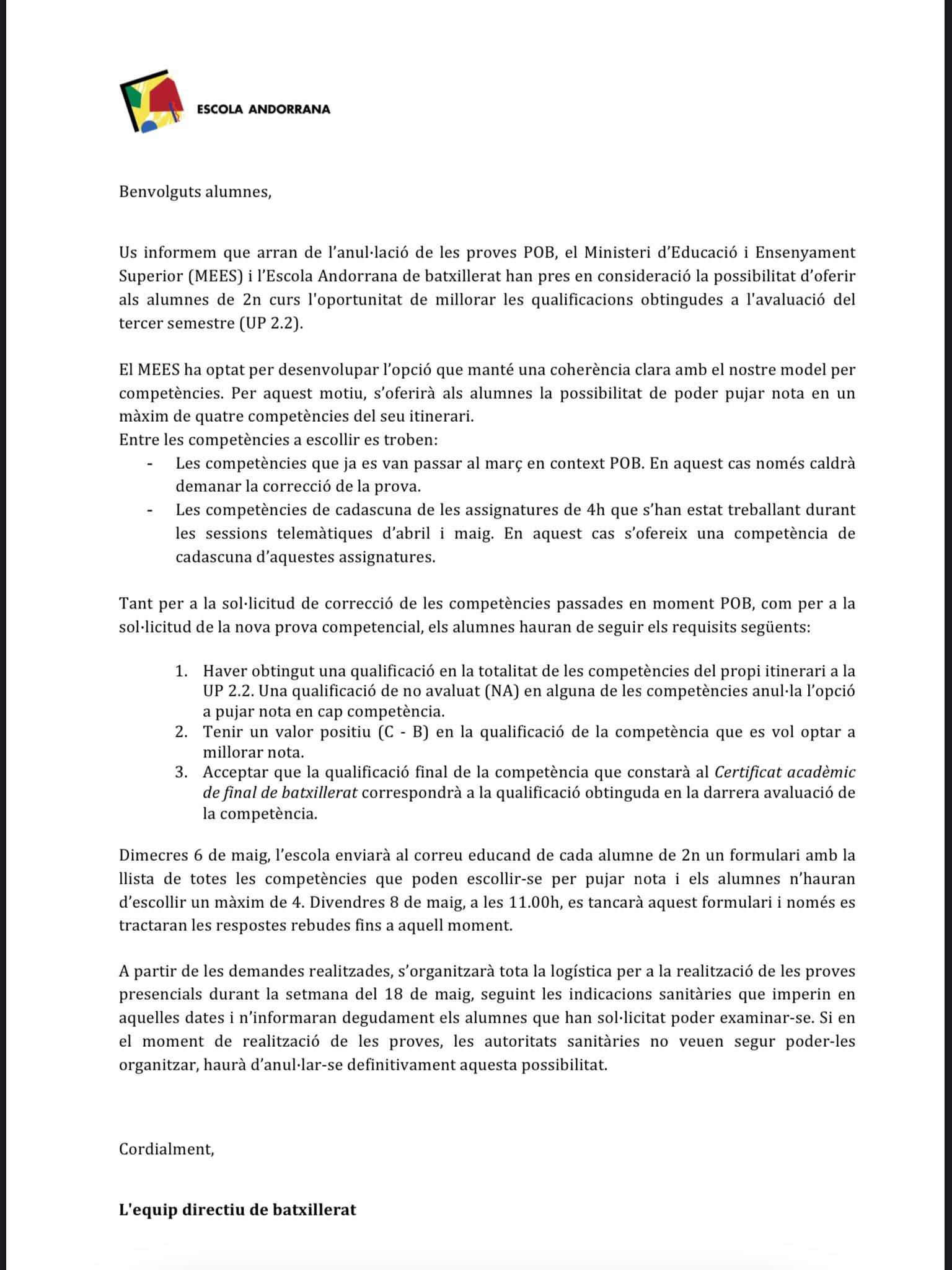 Des del ministeri s’ha enviat una carta als alumnes concernits, missiva a la qual ha tingut accés Altaveu. En ella, s’indica que el ministeri i l’Escola Andorrana de batxillerat “han pres en consideració la possibilitat d’oferir als alumnes de 2n curs l’oportunitat de millorar les qualificacions obtingudes a l’avaluació del tercer semestre. S’afirma que es tracta d’una opció que “manté una coherència clara amb el nostre model per competències”.
