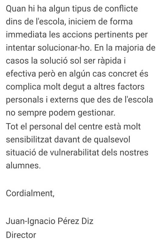 El director del col·legi manté que “quan hi ha algun tipus de conflicte dins de l’escola, iniciem de forma immediata les accions pertinents per intentar solucionar-ho. En la majoria de casos la solució sol ser ràpida i efectiva però en algun cas concret es complica molt degut a altres factors personals”