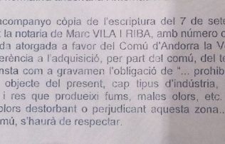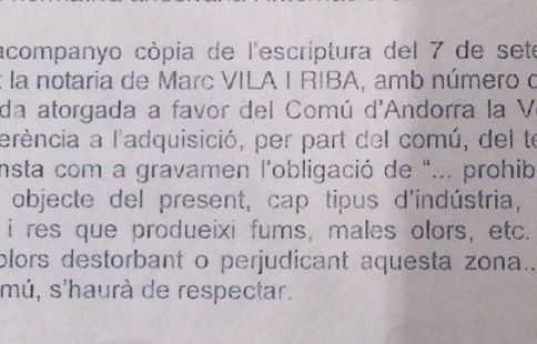 Però d’una carta enviada el 6 de juny del 2013 per Rosa Ferrer, llavors cònsol, al ministre Alcobé, se’n deriva que el terreny de la Comella que hauria estat preseleccionat com a apte, formalment, per una qüestió de pactes, no podria acollir, entre altres, un heliport. Així, en l’esmentada missiva Ferrer explica que hi adjunta una còpia de l’escriptura del 7 de setembre del 1982 i que fa referència a la compra-venda atorgada a favor del comú d’Andorra la Vella”. En aquella escriptura hi consta com a gravamen la prohibició de “construir, en els terrenys objecte del present, cap tipus d’indústria, forns crematoris d’escombraries, i res que produeixi fums, males olors, etc. (…) produeixin sorolls i males olors destorbant o perjudicant aquesta zona”. Deia llavors la cònsol que aquest gravamen suposava un condicionant que “a l’entendre del comú, s’haurà de respectar”. Les fonts consultades consideren que les condicions imposades en forma de gravamen, en el fons, impedeixen la construcció de l’equipament heliportuari.