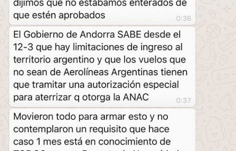 La conversa ha estat compartida a les xarxes socials. Es tracta d’una consulta feta via WhatsApp per un temporer un cop es va informar que el viatge quedava cancel·lat. Des del consolat s’assegura que “a nosaltres ens han consultat per aquests vols i sempre hem dit que no estàvem assabentats que estiguessin aprovats”. A més, s’afirma que “el Govern d’Andorra SAP [en majúscules a l’original] des del 12-3 que hi ha limitacions d’ingrés al territori argentí i que els vols que no siguin d’Aerolíneas Argentinas han de tramitar una autorització especial per aterrar que atorga l’ANAC [Administración Nacional d’Aviación Civil]”.