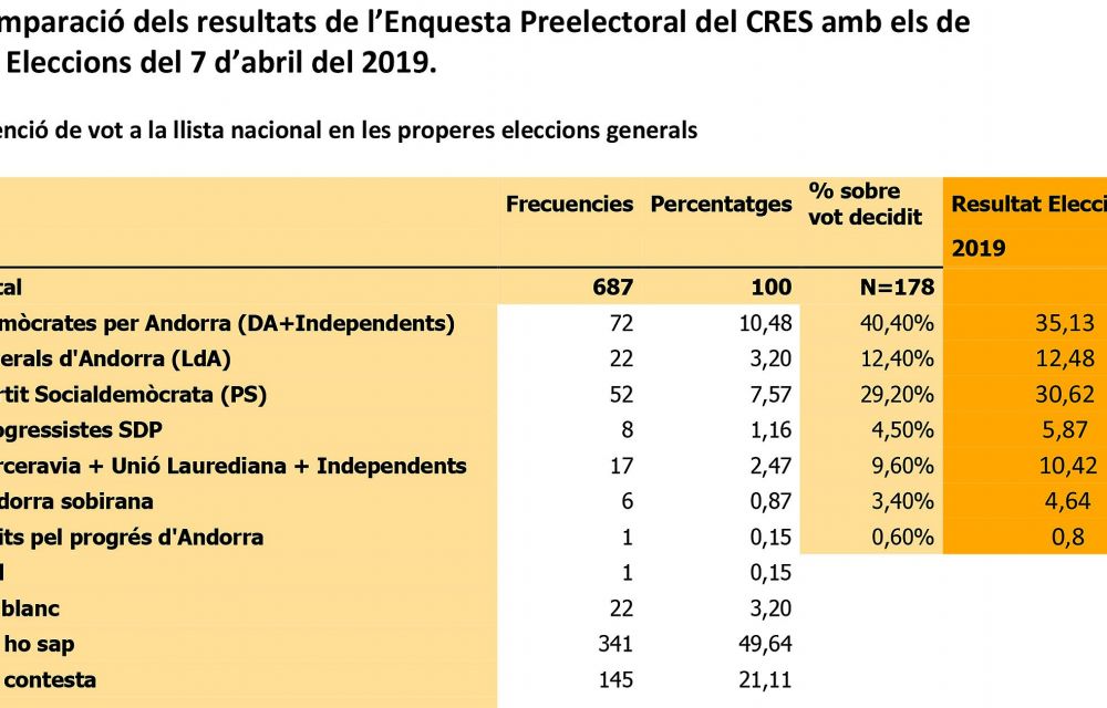 Com ja es va dir en el seu moment i ara ho torna a fer, el CRES remarca que en el sondeig elaborat hi havia una sobrerepresentació d’electors que asseguraven, quan se’ls demanava si recordaven a qui havien votat fa quatre anys, que s’havien decantat per Demòcrates per Andorra (DA). D’aquí que el resultat de l’enquesta mostrés un suport més gran de DA del que realment va obtenir la jornada electoral. El percentatge de vot decidit que s’atribuïa a la resta de formacions s’ha acostat força a la realitat, encara que quedaven lleugerament per sota del que ha estat el resultat a l’urna, segurament, novament, degut a aquella sobrerepresentació que es deia.