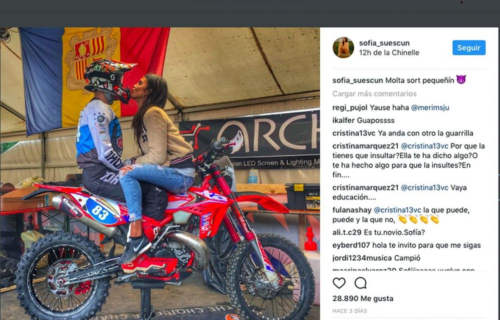 Suescun ha acompanyat Xavi a la ciutat belga i aquest gest li ha estat agraït a ella pel pilot. Però, és clar, les revistes i portals del cor a qui seguien fonamentalment era a ella i han ‘caçat’ una foto a l’Instragram de la també model on tots dos estan damunt la moto, poca estona abans de l’inici de la competició belga, i Suescun fa un petó a España alhora que en el missatge escrit que després va deixar a la xarxa social gràfica la jove model desitjava sort al seu nou amor, com identifiquen al també anomenat “prometedor pilot de motocròs”.