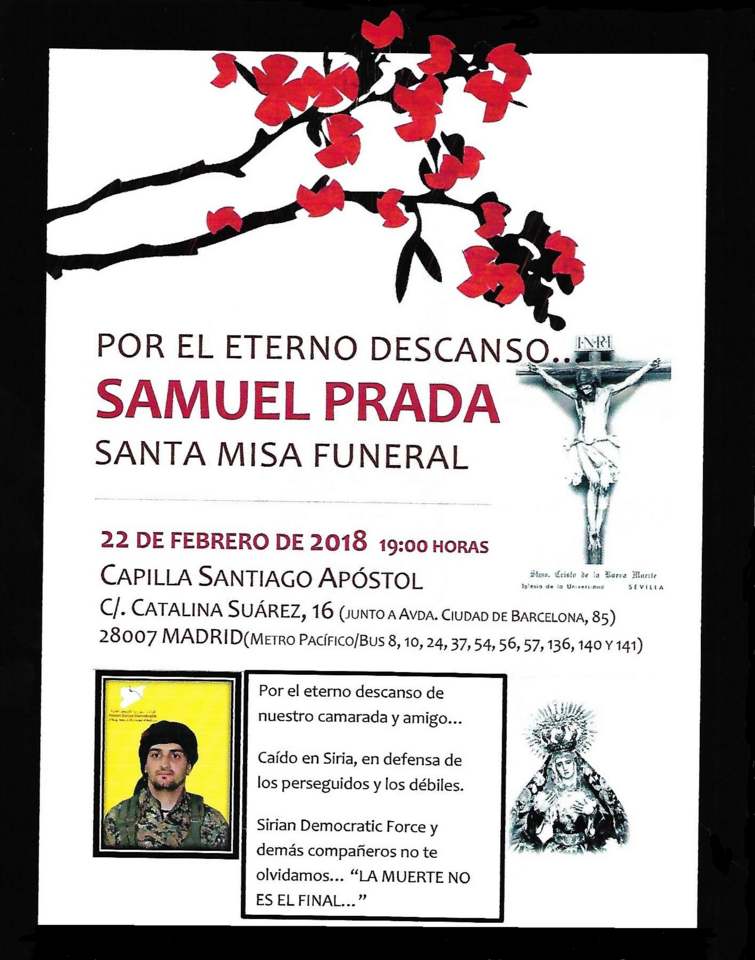 L’associació de voluntaris espanyols en la lluita contra els radicals jihadistes tenen previst celebrar aquesta tarda una missa funeral en memòria i homenatge a Prada León. La cerimònia religiosa s’ha de fer a les 7 d’aquesta tarda a la capella de Santiago Apòstol al carrer Catalina Suárez de Madrid. La missa ha estat àmpliament difosa per les xarxes socials, on l’allau d’elogis vers el jove criat i resident a Andorra es compten a centenars. Dissabte també es farà una altra missa, en aquest cas al punt del migdia (12 hores) a l’església de Sant Pere Màrtir d’Escaldes, la parròquia on estava censat Prada.