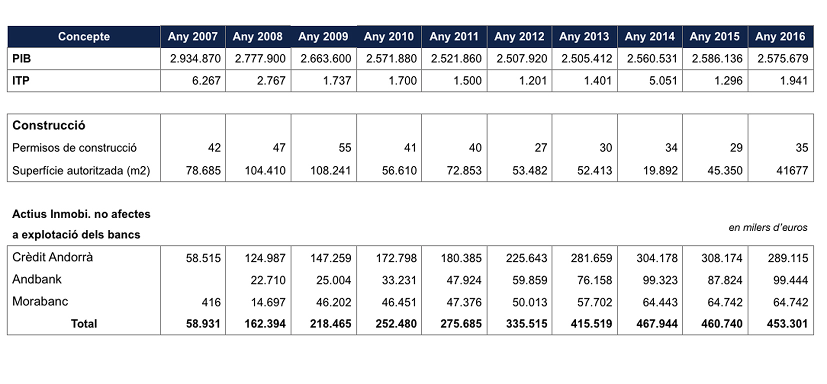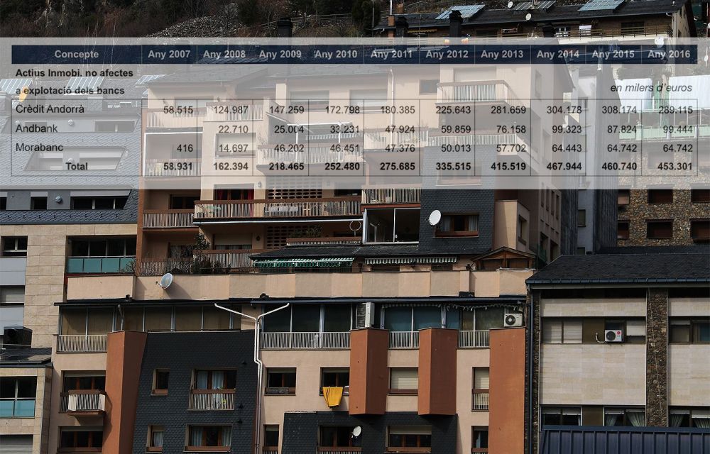 El creixement del parc immobiliari que acumulen els bancs des del 2007 fins al 2016 ha estat progressiu i pràcticament proporcional. La quantitat consignada a aquest capítol (actius immobiliaris no afectes a explotació) ha crescut en tots els casos cada any. El sector en el seu conjunt hauria arribat al sostre de 467 milions el 2014. Aquest mateix exercici la superfície autoritzada de nova construcció tocava fons no arribant ni tan sols als 20.000 metres quadrats, menys de cinc vegades menys que el 2009, quan la xifra va arribar gairebé als 110.000 metres i molt per sota, clar està, que als primers anys d’aquest segle, quan la decretació d’una moratòria urbanística va disparar tots els indicadors en aquest sentit.