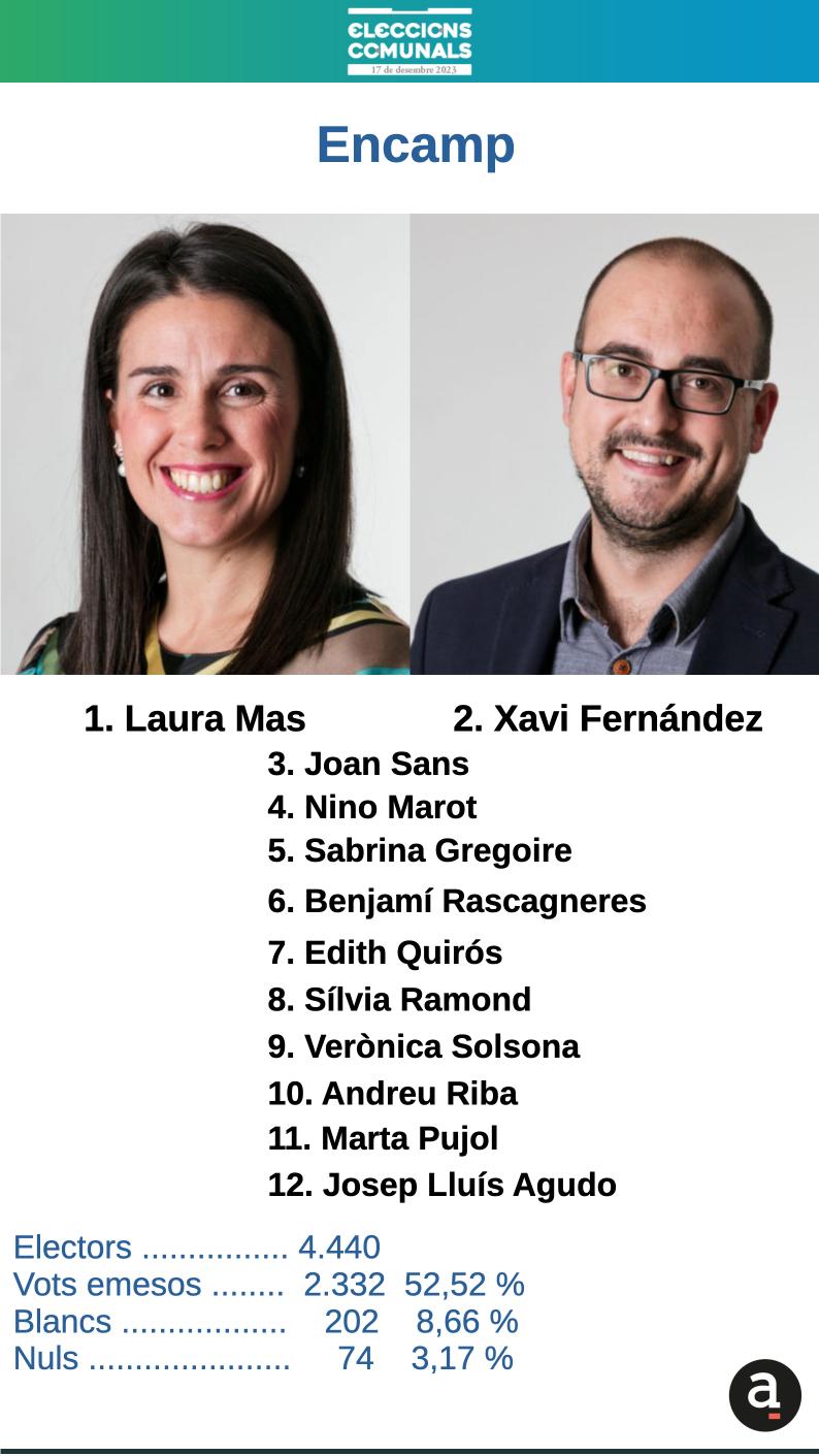 Al final, Mas i Fernández sumen 1.403 vots, el 68,24% dels vàlids. Això suposa més que doblar la llista d’Avancem, que tot just es queda amb 653 (31,76%). També suposa un suport molt més elevat que fa quatre anys -llavors amb quatre llistes-. Es van quedar amb 894. Entren fins a deu consellers, mentre que els socialdemòcrates, gràcies a les restes col·loquen com a consellers Marta Pujol i Josep Lluís Agudo.