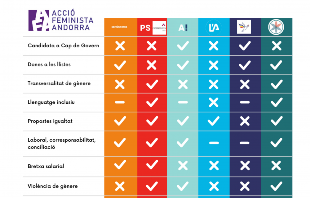 És un de les reflexions que fa el col·lectiu presidit per Laia Farré després d’analitzat “amb perspectiva de gènere” tant els programes com les candidatures que presenten cadascuna de les formacions que es concorren a les eleccions del 2 d’abril. Segons que expliquen les activistes en un comunicat, l’objectiu de l’avaluació programàtica “ha estat analitzar i investigar quines són les propostes que presenten les diferents candidatures en matèria d'igualtat de gènere als programes electorals, ja que aquests representen el full de ruta i els compromisos polítics que adquireixen, amb l'electorat, els partits polítics que es presenten als pròxims comicis. I que, en cas d'arribar al Govern, hauran de desenvolupar”.