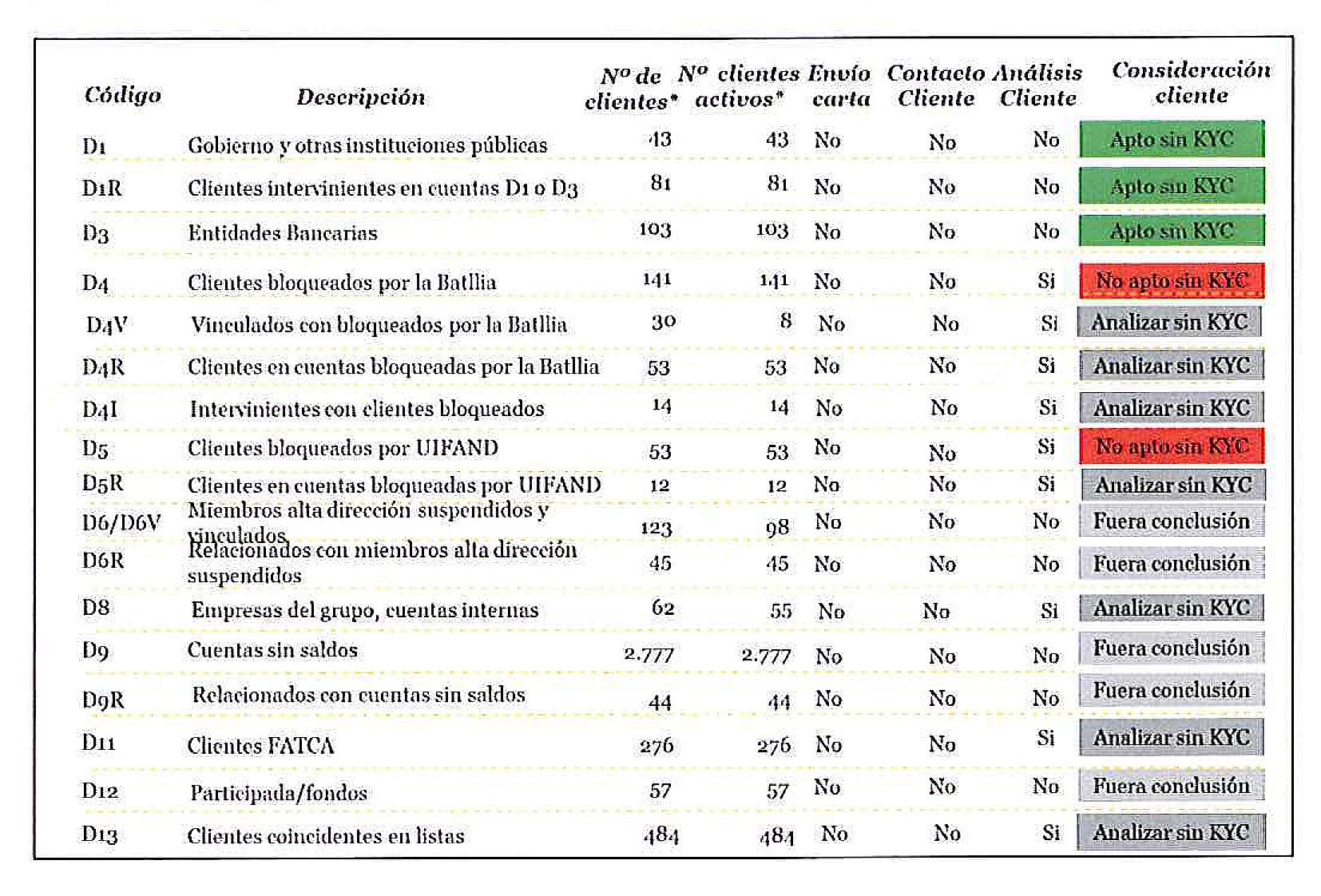 Mentre hi va haver clients i comptes que es consideraven ‘exemptes’ de revisió, les mateixes autoritats van ordenar a la consultora encarregada de la revisió de comptes que es declaressin no aptes sense cap mena d’anàlisi tant els clients bloquejats per la Batllia com aquells que havia paralitzat la UIFAND. De l’informe es desprendria que els ordenants d’aquesta suposada anàlisi discriminatòria serien, com a mínim, l’Institut Nacional Andorrà de Finances (INAF) i l’esmentat i cada vegada més controvertit AREB.
