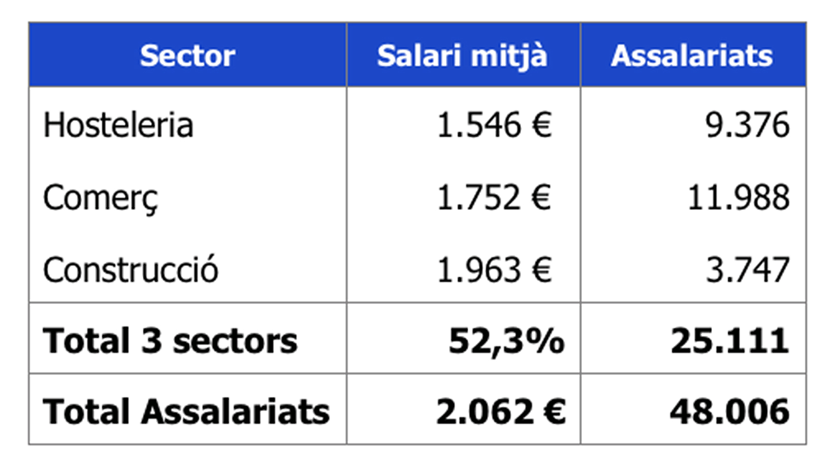 En efecte, entre hostaleria, comerç i construcció sumen, sempre segons les dades de la CASS, 25.111 dels 48.006 assalariats que hi havia al terme del darrer exercici tancat. Percentualment, per tant, representen el 52,3% dels assalariats. El grup més important dels tres esmentats, actualment, és el comercial, que emplea pràcticament 12.000 persones (11.988); el segueix l’hostaleria amb 9.376 i en darrer terme s’hi troba la construcció, que experimenta una lleugera recuperació després d’una franca davallada i ara ocupa 3.747 persones.
