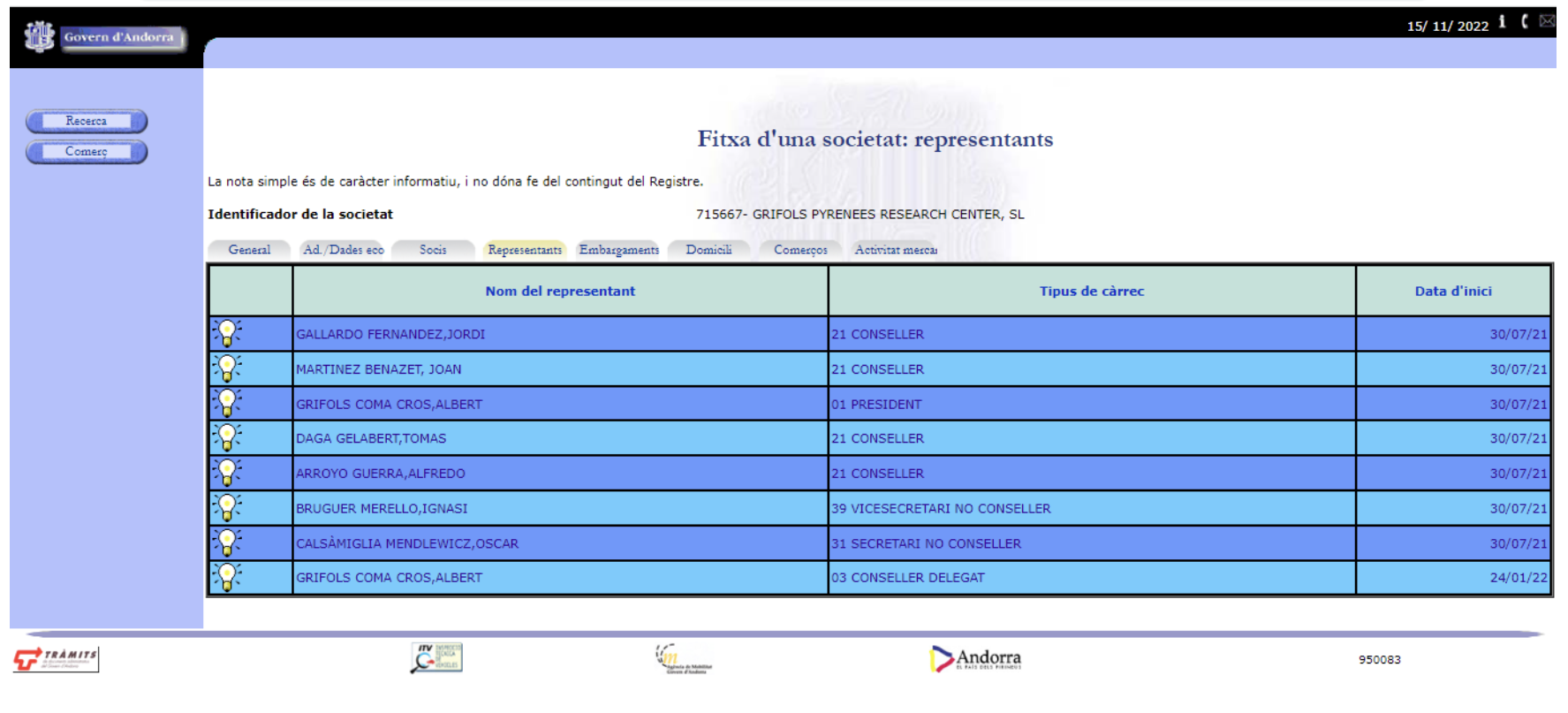 Però tampoc la part estatal s’hauria encarregat de fer els deures. L’exministre Joan Martínez Benazet, encara aquest novembre, continua apareixent al registre de societats com a conseller de la societat al costat de Jordi Gallardo. Grifols Pyrenees Research, dominada al 80% per la multinacional, està presidida, almenys per ara, per Albert Grifols Coma Cros, que exerceix alhora de conseller delegat. I té de consellers, a banda dels dos representants del Govern, a Tomàs Daga i Alfredo Arroyo. Òscar Calsàmiglia i Ignasi Bruguer figuren com a secretari i vicesecretari, en tots dos casos no consellers.