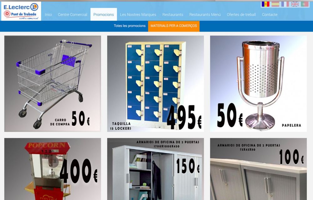 A través de la seva pròpia pàgina electrònica, E.Leclerc Punt de Trobada ha creat una pestanya de promocions en què ara per ara sols hi ha el sub-capítol materials per a comerços. En ell s’hi poden trobar anunciades des de carros de la compra per 50 euros, cistelles per 9 o 10, armaris i material d’oficina divers (sempre mobiliari), estanteries, o neveres i congeladors, que són els productes taxats en un valor més elevat, entre 4.100 euros i 6.000 euros.