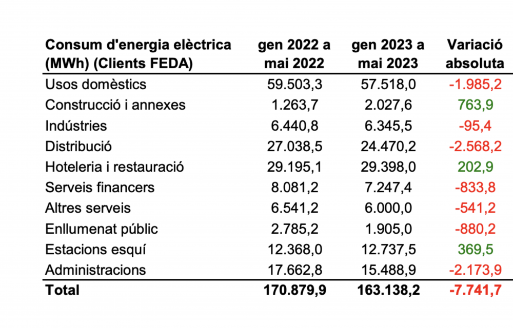 La reducció que hi ha hagut els cinc primers mesos de l’any en relació amb el mateix tram de l’any passat és del 4,5%. Aquestes dades, ofertes pel departament d’Estadística, tenen a veure amb els indicadors de FEDA. Si es va més enllà de la principal companyia del país, la variació continua sent negativa però és menys notable, essent tan sols del 2,6%. Si s’agafen les dades només del baix, un factor interessant és el fet que hi ha hagut un increment molt notable de la importació d’electricitat a diferència de l’any passat. En canvi, la producció pròpia ha caigut producte que els cabals d’aigua no són els que hauria.