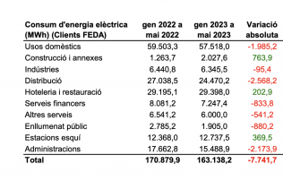 Pel que fa al consum dels clients de FEDA, el consum total pel mes de maig del 2023 ascendeix a 24.427,7 MWh, amb una variació del -3,3% respecte al mateix mes de l’any passat. Quant a les dades acumulades, el consum ha estat de 163.138,2 MWh des del gener i de 361.289,9 MWh durant els darrers 12 mesos, xifres que suposen unes variacions del -4,5% i -2,8%, respectivament.