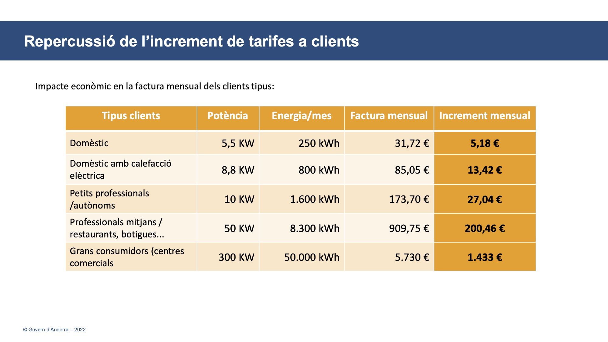 D’aquí surt una forquilla que va de 5 a 15 euros mensuals, aproximadament. I els percentatges es van incrementant fins al 25% que s’aplicarà als grans consumidors. O el 26% que es carregarà a les distribuïdores parroquials que, però, han d’aplicar les tarifes estatals acordades, que no tenen cap tipus d’increment si són bonificades. És a dir, en aquells domicilis (se’n beneficien un miler de persones) en què es rep algun tipus de prestació social d’ajut no hi ha lloc a pagar més d’electricitat. S’ha mirat “d’evitar al màxim l’impacte sobre les famílies”, ha deixat clar la titular de Medi Ambient.