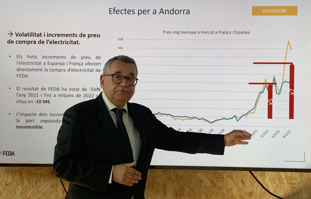 FEDA treballa en un trencaclosques amb múltiples hipòtesis per tal de mirar de preveure què pot passar. La companyia compra a l’exterior, entre Espanya i França, el 79% de l’energia que consumeix el Principat. La meitat de l’electricitat que necessita el país està garantida per contracte a un preu tancat. I un de cada cinc kilowatts necessaris es produeix localment. El problema és el 29% del consum que es compra fora i a preu de mercat. ¿Quin serà aquest preu els propers mesos? No se sap. Com tampoc Moles ha volgut dir el percentatge d’increment de la tarifa que preveu.