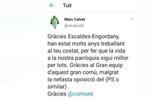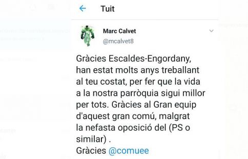 Calvet iniciava la piulada donant les “gràcies” a Escaldes i recordant que “han estat molts anys treballant al teu costat, per fer que la vida a la nostra parròquia sigui millor per a tots” i estenia l’agraïment també al “gran equip d’aquest gran comú”. Aquí és on relliscava, ja que va afegir “malgrat la nefasta oposició del (PS o similar)”.