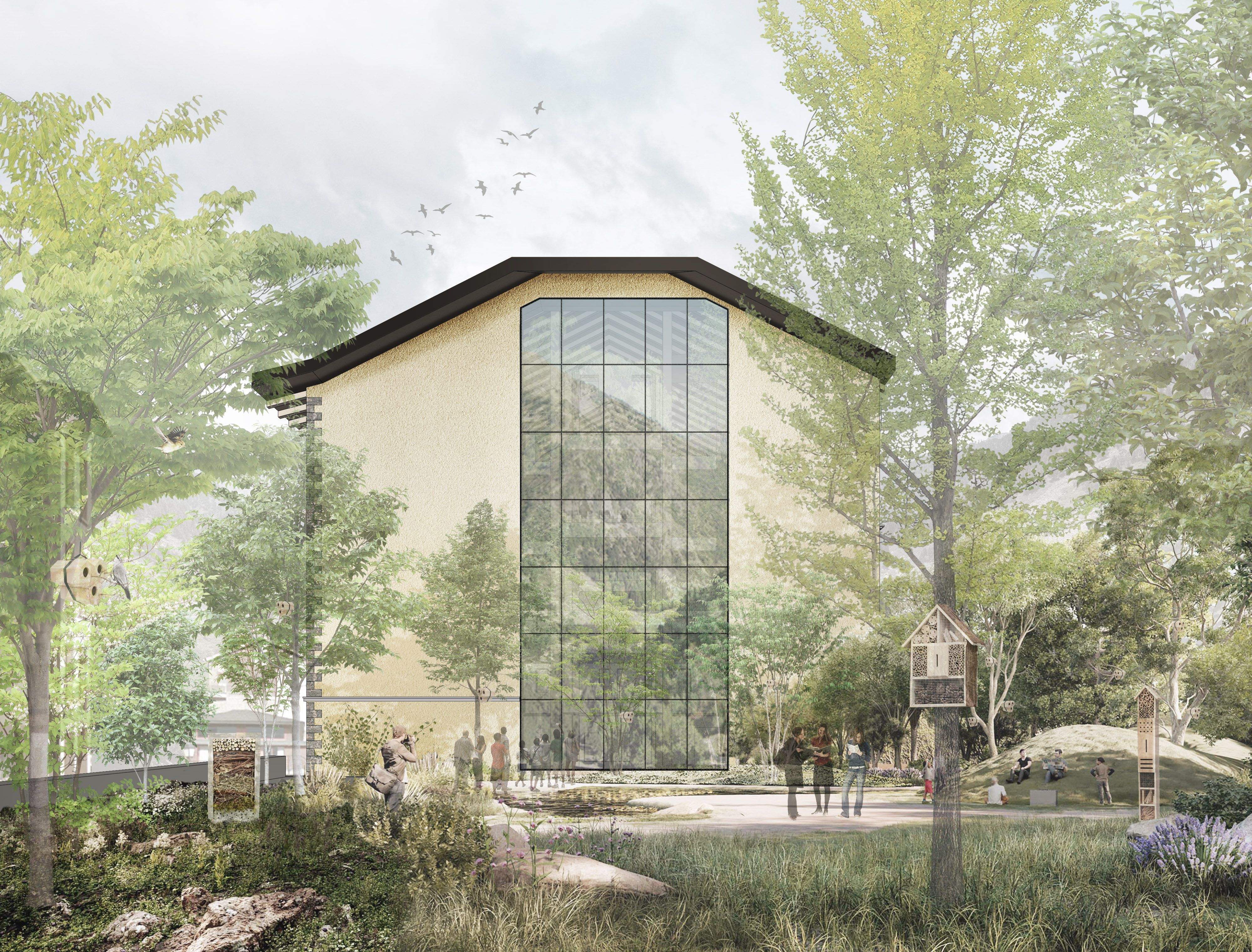 De l’actuació projectada per l’equip de Mercè, en sobresurt el fet de crear una plaça emboscada just al costat de l’edifici principal i al damunt de l’actual cotxera, que es convertirà en un aparcament per a unes 20 places i en la base de l’esmentat bosc caducifoli o els autors de la proposta guanyadora hi volen col·locar des de nius per a ocells fins a ‘hotels’ d’insectes per convertir l’entorn en el màxim de natural possible. Aquest espai exterior, que serà d’accés públic, serà del tot visible des del futur ministeri a través d’un mur cortina que ocuparà la part central de la façana lateral inferior, que no s’ha de preservar com està.