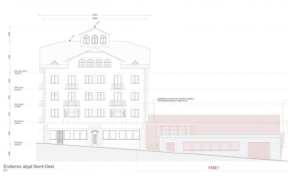 La feina de rehabilitació, s’ha dit, s’ha dividit en dues fases, de les quals només la primera és ara per ara la que es licita. Es tracta d’un concurs nacional obert que dona marge fins al 23 d’octubre a les 5 de la tarda a les empreses que hi vulguin concórrer perquè puguin presentar les seves ofertes. En aquesta primera fase, segons que s’indica en el projecte, es preveu l’enderroc de tots els elements no estructurals interiors de l’edifici existent de l’antic Hotel Casamanya; el sosteniment provisional del mur sud de l’aparcament; l’enderroc de l’existent elements estructurals de l’aparcament; o els moviments de terres en empremta de l’aparcament.