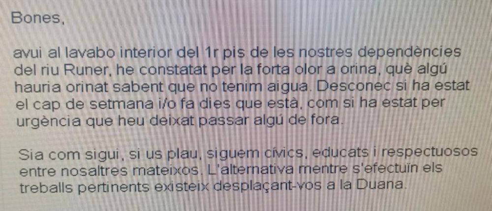 El responsable policial ha arribat a fer un comunicat intern queixant-se de la situació. “He constatat la forta olor a orina, que algú hauria orinat sabent que no tenim aigua”. Per tant, ni en cas d’urgència no es poden usar les instal·lacions. “L’alternativa mentre s’efectuïn els treballs pertinents existeix desplaçant-vos a la Duana”.