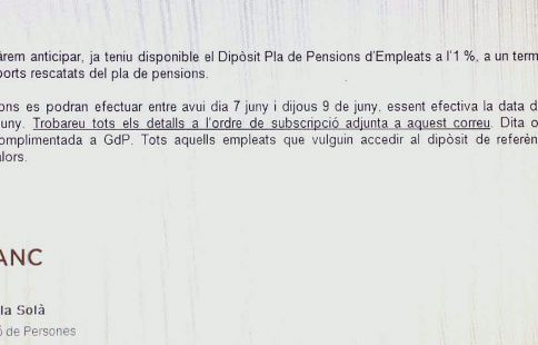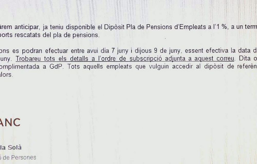 En la comunicació s’explica que les subscripcions es podran fer entre el 7 i el 9 de juny, “essent efectiva la data de subscripció el dilluns 13 de juny”. La nota també informa que “tots aquells empleats que vulguin accedir al dipòsit de referència han de tenir contracte de valors”. La immensa majoria dels treballadors el que volen és recuperar i poder disposar dels diners que al seu dia van invertir en el pla de pensions.