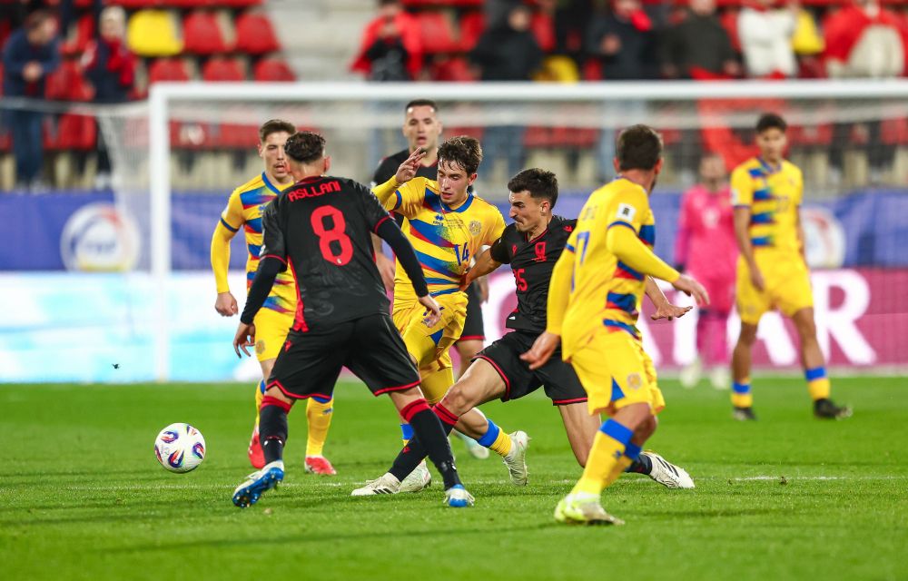 Els tricolors han aguantat bé la primera meitat davant una Albània sostinguda pels seus aficionats, que no s’han cansat de cantar. Sobre el terreny de joc, però, els andorrans han pogut encadenar passades en camp contrari i no han concedit massa perill excepte en un parell d’ocasions. Primer ha estat en una pilota dins l’àrea on Manaj ha sabut girar-se a la perfecció, però ha topat amb la defensa, i més tard una falta perillosa d’Asllani ha marxat per damunt del travesser. La més clara, però, ha estat d’Andorra, amb un xut de Rodrigo prop de la frontal que ha sortit amb molta intenció a l’esquadra. Tot i així, amb el pas dels minuts els tricolors han començat a endarrerir les línies. I just abans del descans, un córner servit per Laci l’ha pogut rematar Djimsiti amb molta força topant amb el travesser, amb Manaj desaprofitant el rebot.