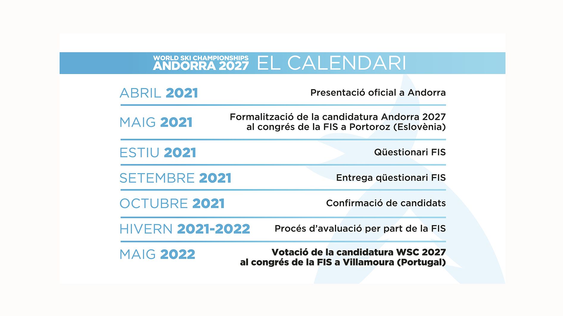 En silenci i discretament, un equip de professionals multidisciplinars sota la coordinació de Grandvalira fa alguns mesos que treballen en l’elaboració de la candidatura, que té evidentment l’aval i l’acompanyament de la Federació Andorrana d’Esquí (FAE) i que es ‘ven’ com una candidatura de país. Amb el tret de sortida de l’anunci d’aquest dimarts -via un programa televisiu especial atès que la pandèmia ha fet impossible celebrar una cerimònia de presentació de la candidatura- i la inscripció oficial en pocs dies davant de la FIS, s’engega un any de molta més feina, en bona part també de diplomàcia esportiva, per intentar fer veure que la proposta que presenta Andorra és la millor de totes les que finalment competeixin. L’octubre s’haurien d’oficialitzar tots els aspirants i la resolució final arribarà a la localitat de Villamoura (Portugal) durant el Congrés FIS del maig 2022.