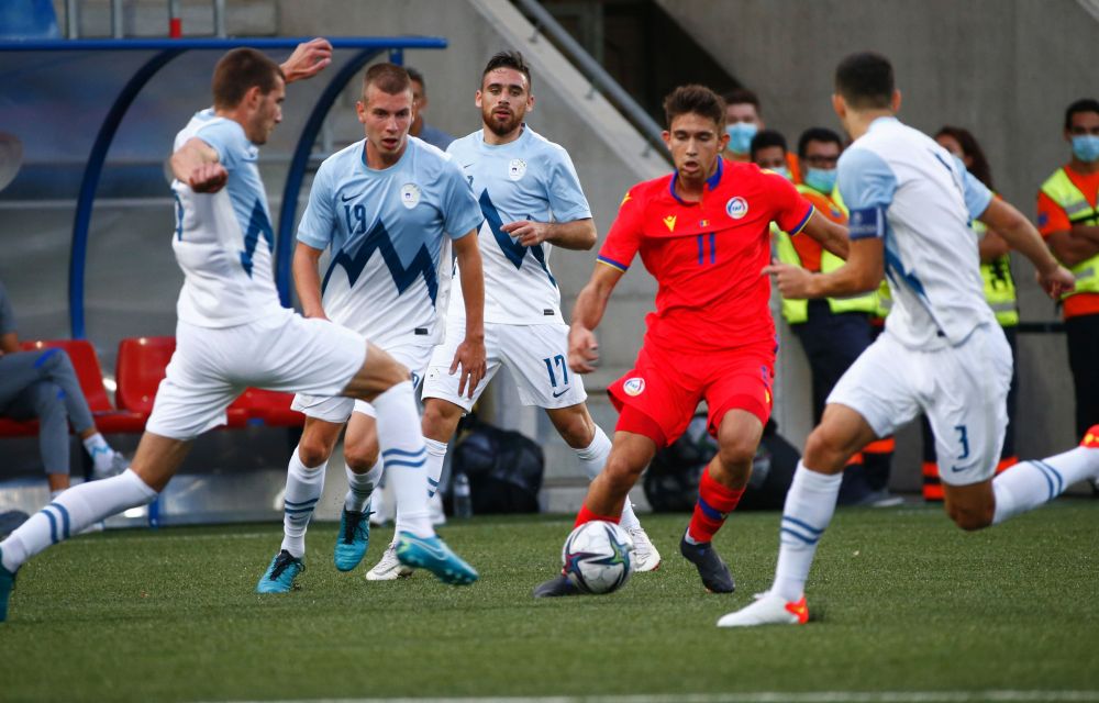 L'inici ha estat marcat per un joc trabat, amb moltes faltes, i sense ritme. En els primers 27 minuts, l'àrbitre ja havia mostrat tres targetes grogues. El domini corresponia als eslovens però la defensa andorrana no tenia problemes per frenar els atacs que es limitaven a penjar pilotes a l'olla. La millor oportunitat per als eslovens arribaria al minut 45 amb un remat de Žugelj que aturaria Rodríguez sense problemes. Andorra també ha gaudit d'ocasions que no ha pogut materialitzar.