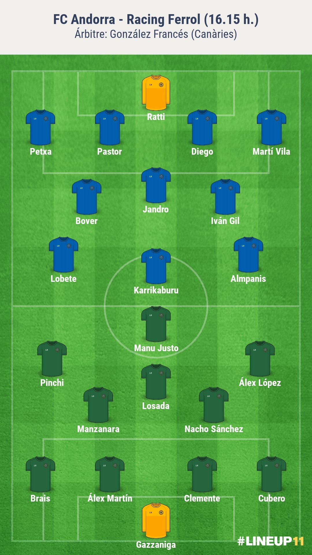 Per tant, no s’espera gaires novetats a l’onze de l’Andorra. Almpanis i Martí Vilà podrien ser dos dels jugadors que tinguin minuts d’inici, ja que seria un premi per tot el que han patit aquest any amb les lesions. La resta, els nou jugadors més habituals de l’etapa Costa: “Posaré a la gent que crec que més ens apropa a guanyar el partit, principalment perquè és el que mereix la nostra gent i perquè sempre que trepitjo un camp de futbol ho faig amb la intenció de guanyar. Confio en el fet que ells sentin el partit amb la mateixa responsabilitat que ho faig jo”, ha reflexionat.