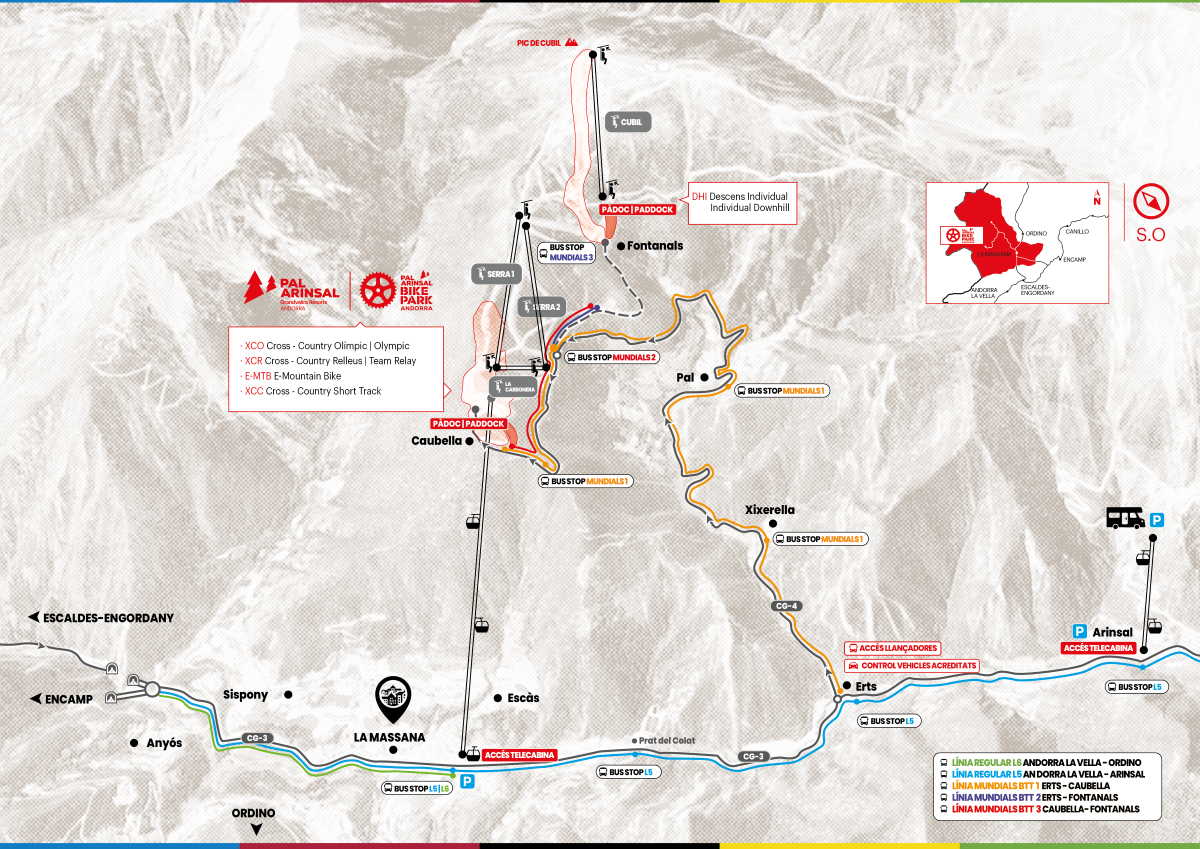 En cas de no voler accedir amb telecabina, els visitants també podran apropar-se a la parada ubicada a la rotonda d’Erts, on els diferents autobusos de l’esdeveniment circularan fins a la venue de la Caubella (on duen a terme proves de Cross-country) o fins al camp de tir, on podran arribar a peu fins a la venue descens. L’accés d’animals de companyia no estarà permès en els autobusos habilitats. Ambdues opcions requeriran ser posseïdor d’una entrada per gaudir dels Mundials. Cal recordar que l’accés amb vehicle estarà molt restringit i només es permetrà l’accés fins a la parròquia de la Massana o el poble d’Arinsal.