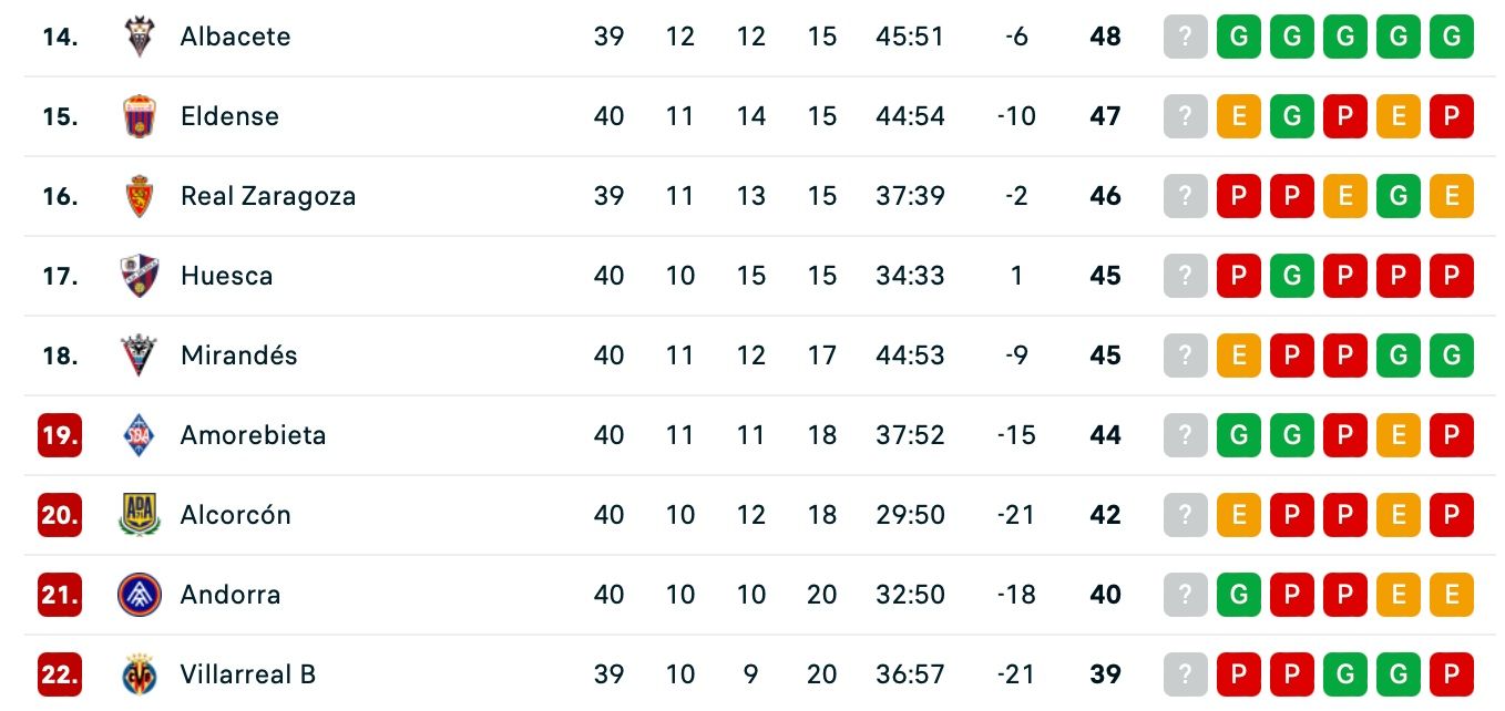 El transcurs de la jornada 40, l’antepenúltima de LaLiga Hypermotion, està sent prou beneficiós per als interessos de l’Andorra. Els tricolors han evitat confirmar un descens que s’hagués produït en el cas que dos equips com el Mirandés i l’Osca, també en la corda fluixa -45 punts-, haguessin aconseguit una victòria en els seus duels respectius contra l’Elx (1-1) i el Racing de Santander (0-3).