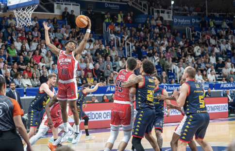 Pustovyi trencava amb un parcial de 0-7 dels murcians i Pons tornava a deixar el duel en una sola possessió (73-75). Però DeJulius anotava des de fora altra vegada. Males notícies que el millor jugador de l’UCAM tornés a trobar-se amb l’encert. Afortunadament pels tricolors, Cacok marxava eliminat amb cinc faltes i posava en bonus al seu equip a cinc pel final. Però un altre dels botxins visitants ha estat Kelan Martin, que anotava el seu cinquè triple per posar la màxima pels de Sito Alonso (74-81).