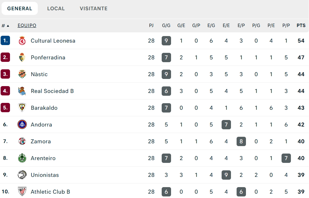 Els tres primers classificats, que actualment són la Cultural Lleonesa, la Ponferradina i el Nàstic de Tarragona, en canvi, haurien sumat 10, 10 i 11 victòries, respectivament, al descans. Una estadística que posa en relleu un dels aspectes a millorar dels andorrans. Preguntat per quins són els motius d’aquesta desconnexió, que està penalitzant l’equip especialment fora de casa, l’entrenador tricolor és conscient que és una de les assignatures a millorar: “El rival apreta, també coneix els nostres punts dèbils i sap on estem patint més, i posa èmfasi en tot això. Nosaltres elaborem un pla de partit, però el rival també ho fa per contrarestar-nos a nosaltres, guanyar-nos i incomodar-nos, com ha estat a la primera meitat”, va explicar el míster.