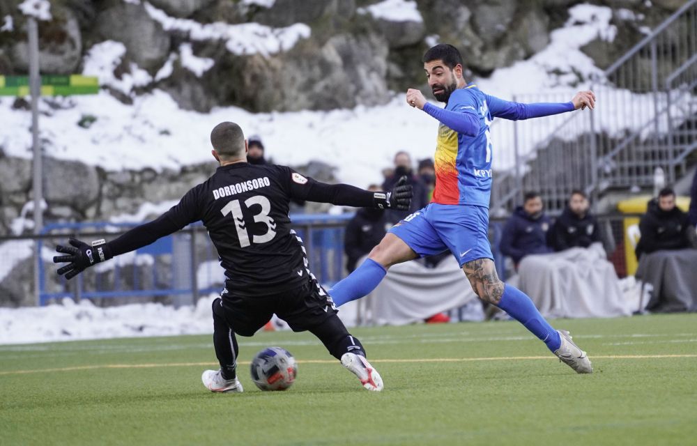 Al tram final del primer temps, ara sí, els de Nacho Castro han agafat de forma clara les regnes del partit. Ho han intentat amb insistència, però no han trobat l’empat. Carlos ha tingut la millor opció per a la igualada en una pilota llarga amb la qual ha intentat superar per dalt Dorronsoro. El porter escapulat, però, no s’ha deixat sorprendre.