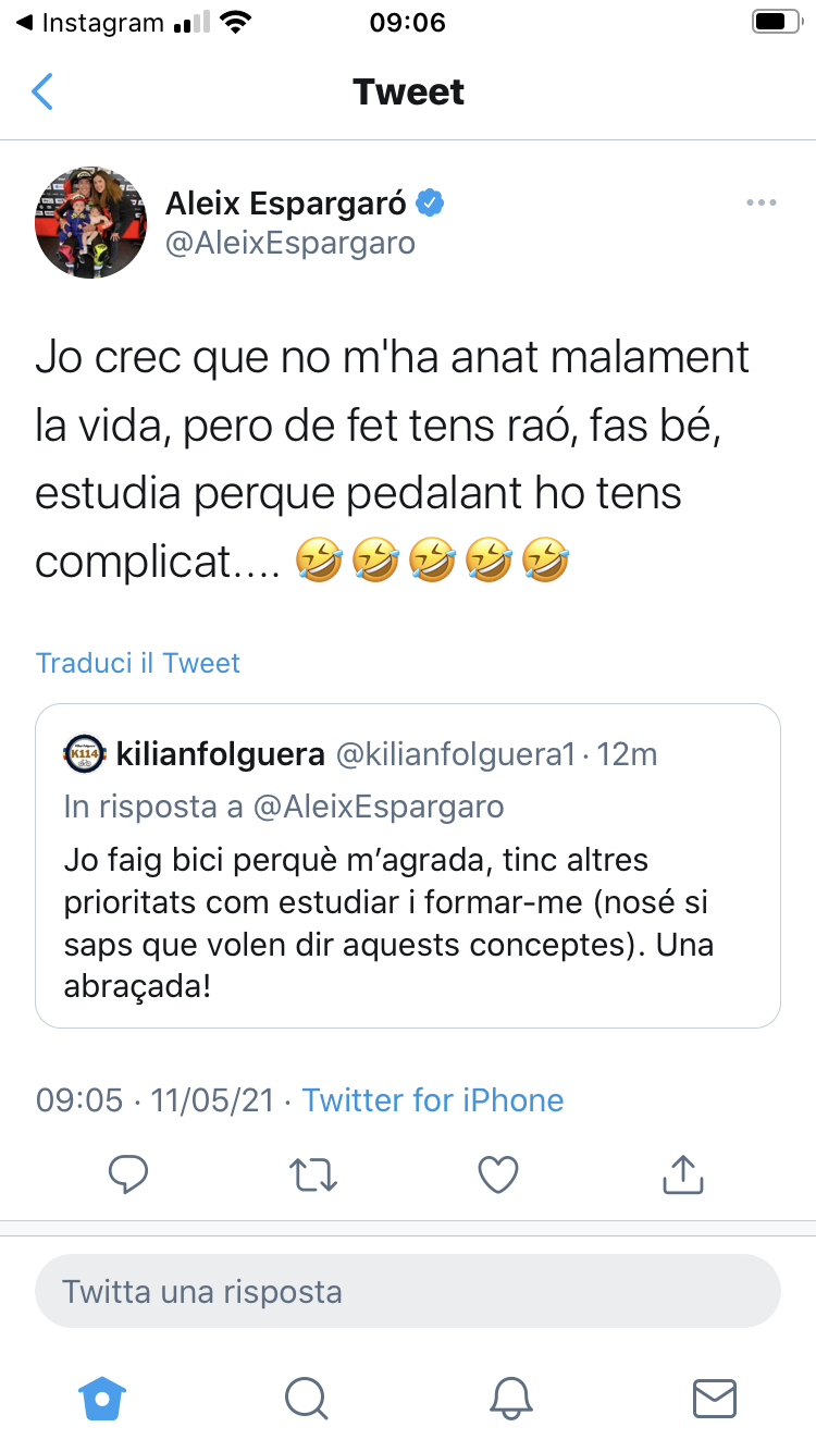 El ‘biker’ andorrà no s’ha mossegat la llengua a l’hora de respondre-li. “Jo faig bici perquè m’agrada, tinc altres prioritats com estudiar i formar-me (no sé si saps què volen dir aquests conceptes). Una abraçada”, ha piulat. Espargaró ha volgut dir la darrera paraula: “Jo crec que no m’ha anat malament la vida, però de fet tens raó, fas bé d’estudiar perquè pedalant ho tens complicat”.