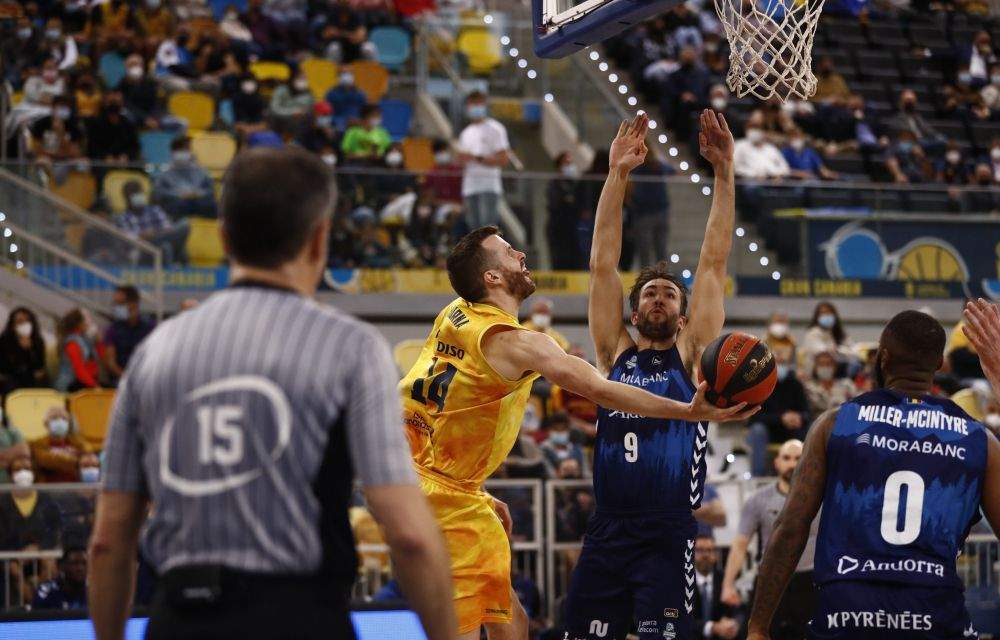 El MoraBanc s'ha trobat amb un problema d'entrada com ha estat la lesió al turmell de Morgan en els primers minuts en un quart protagonizat pels quatre triples andorrans, obra de jugadors poc habituals des de la distància com Paulí (2), Llovet i Diagne. Això ha fet que dels 16 punts, 12 fossin des de la línia de 6,75 m. A l'inici del segon quart, el Granca ha sortit amb dos bases. Un triple de Clevin Hannah i un esmaixada d'Olomuyiwa han posat els tricolors per davant en el marcador (20-21) aprofitant dues pèrdues de pilota locals.